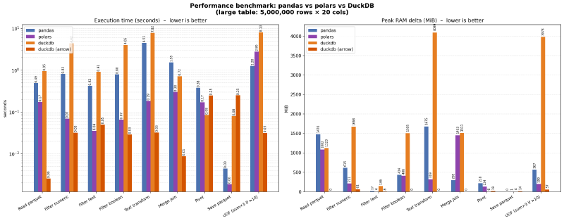 I compared the performance of Pandas 3.0, Polars, and DuckDB processing both large (5 million rows) and small tables. The goal: measure execution time and RAM usage for typical data analysis operations.