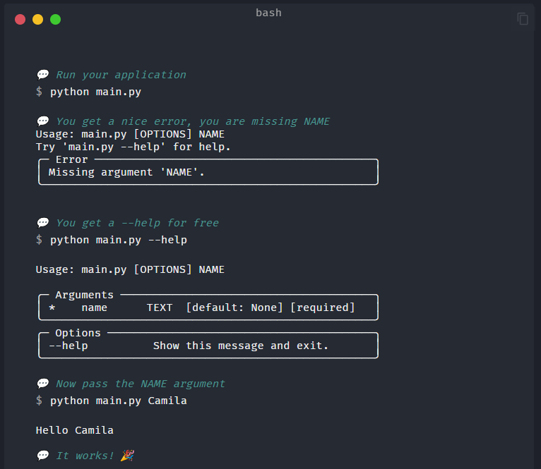 --helpand autocompletion. - 🧱 Scalable: suitable for both simple scripts and complex tools.